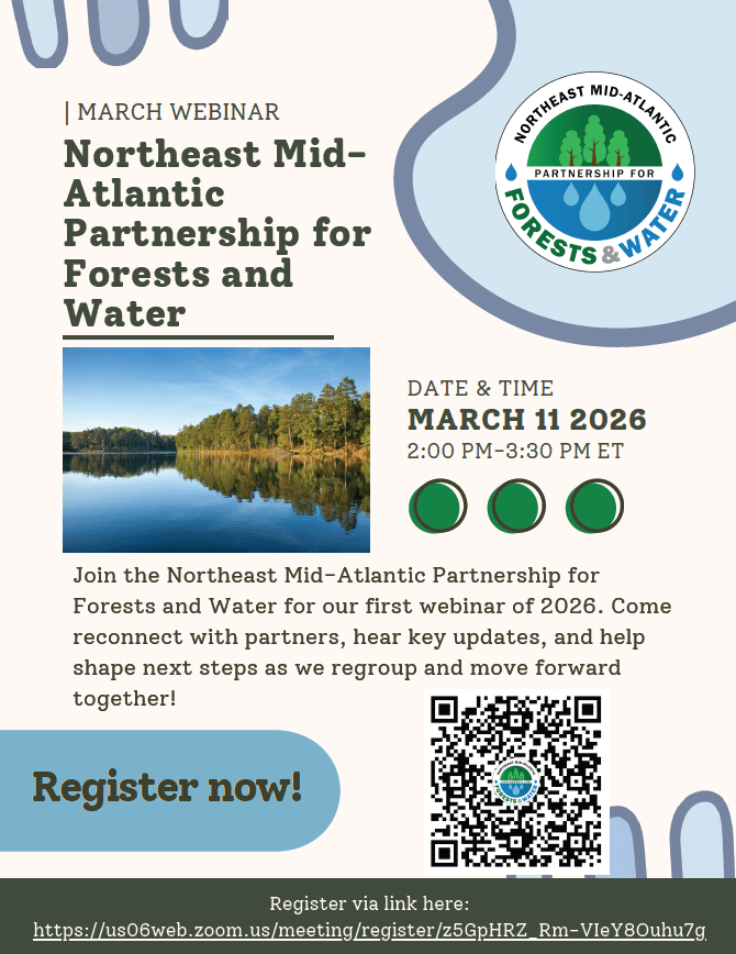Join the Northeast Mid-Atlantic Partnership for Forests and Water for our first webinar of 2026! Come reconnect with partners, hear key Partnership and state project updates, and help shape the next steps as we regroup and move forward together! Registration is open – sign up here!